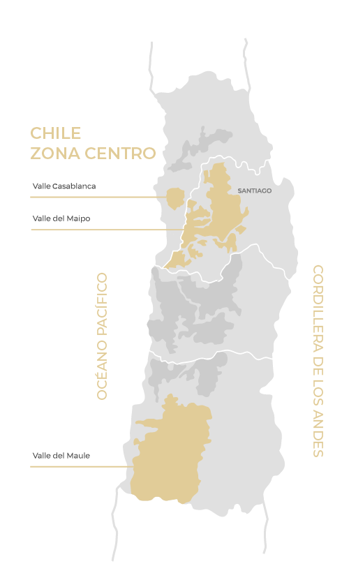El Maipo es sinónimo de Cabernet. Sus suelos aluviales y clima templado, con veranos secos y gran amplitud térmica, permiten una maduración lenta y controlada que da estructura, elegancia y tipicidad a esta cepa.
